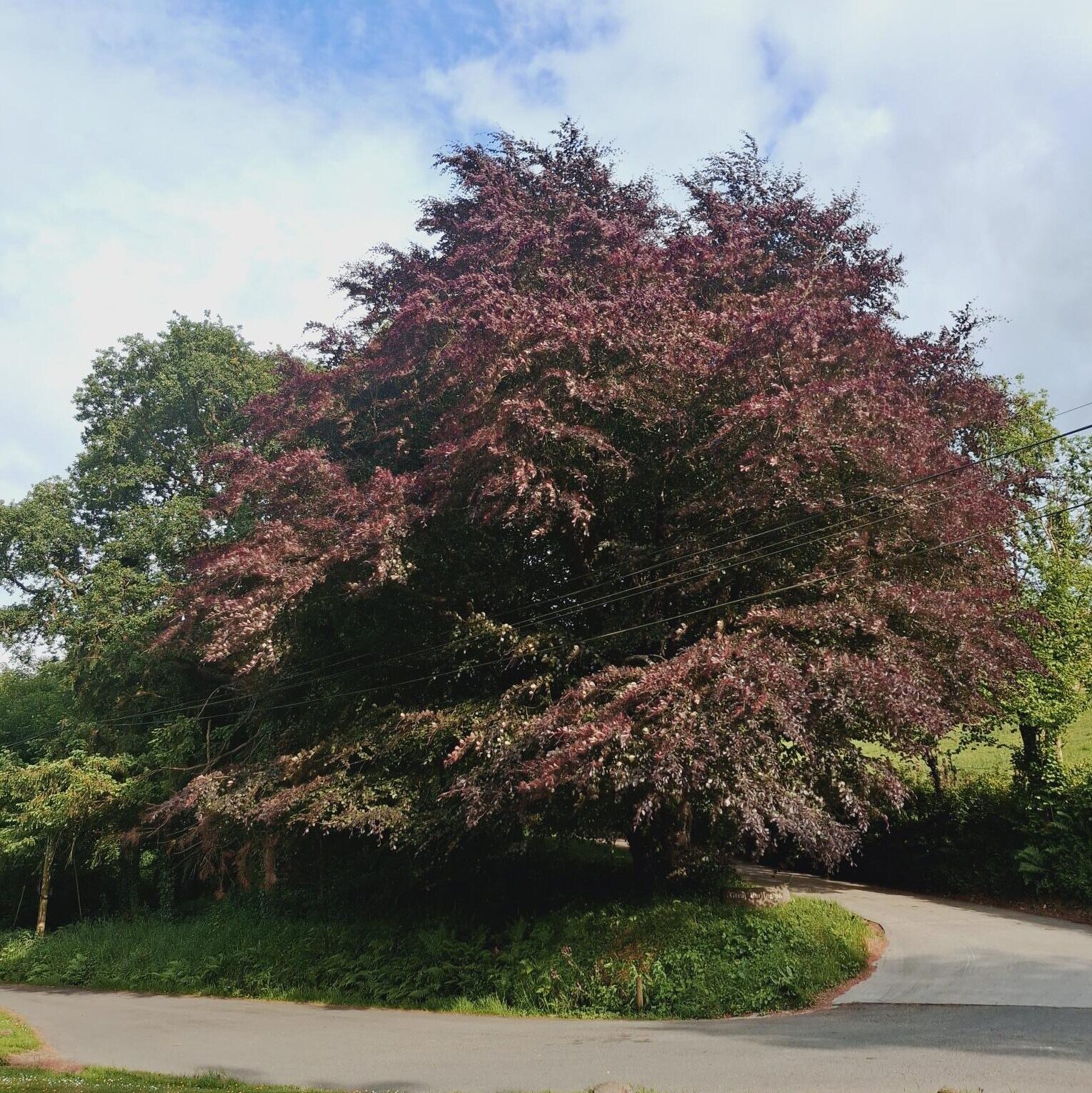 Unfortunately some Satnavs can abandon you just before you reach us but if you keep going down the same road, you will drive through a little wood which opens out to a passing place and you will see our lovely Copper Beech at the entrance and our stone sign.